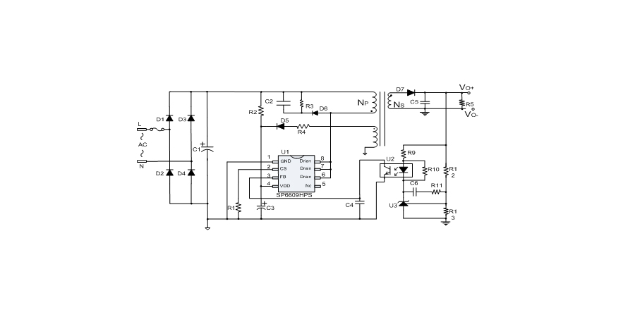 SP6609HPS內置多種保護,包括逐周期限流保護(OCP),過載保護(OLP),過壓保護(OVP),VDD過壓箝位,欠壓保護(UVLO),過溫保護(OTP)等,通過內部的圖騰柱驅動結構可以更好的改善系統的EMI特性和開關的軟啟動控制。