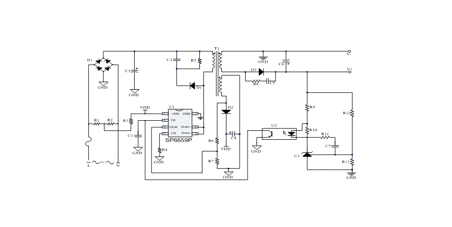 SP6659P是一顆高性能、多工作模式的PWM控制芯片。芯片可以工作在跳頻及綠色模式,以此來減小空載和輕載時的損耗,也可以工作在QR工作模式及CCM工作模式,提高整機的工作效率。SP6659P在啟動和工作時只需要很小的電流,可以在啟動電路中使用一個很大的電阻,以此來進一步減小待機時的功耗。SP6659P內置多種保護,包括:輸入電壓過低保護(Brown-out),輸出電壓短路保護,VDD過壓保護(OVP),VDD過壓箝位,VDD欠壓保護(UVLO),過溫保護(OTP)等。
