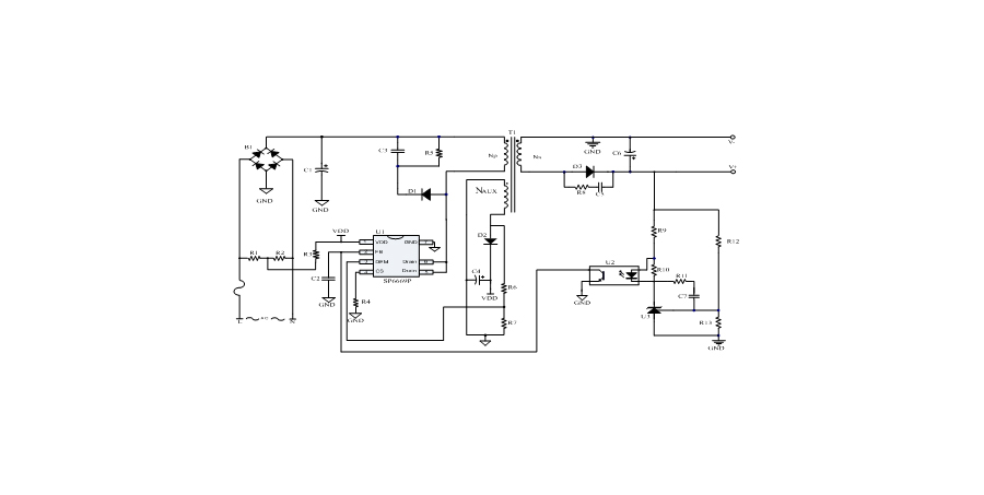 SP6669P是一顆高性能、多工作模式的PWM控制芯片。芯片可以工作在跳頻及綠色模式,以此來減小空載和輕載時的損耗,也可以工作在QR工作模式及CCM工作模式,提高整機的工作效率。SP6669P在啟動和工作時只需要很小的電流,可以在啟動電路中使用一個很大的電阻,以此來進一步減小待機時的功耗。SP6669P內置多種保護,包括:輸入電壓過低保護(Brown-out),輸入電壓過高保護(Lineovp),輸出電壓過壓保護(VO_OVP),輸出二極管短路保護(SSP),逐周期過流保護(OCP),過載保護(OLP),VDD過壓保護(OVP),VDD欠壓保護(UVLO),過溫保護(OTP)等。