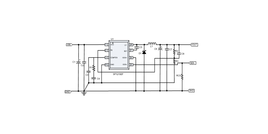 SP1215EF是一款降壓型PWM轉換器,典型輸出驅動電流為3.5A無需外加晶體管。設計允許它可在8V~40V的寬輸入電壓下工作。通過將COMP/EN腳邏輯電平拉低來控制外部關斷功能,使其進入待機模式。外部補償使反饋控制具有良好的線電壓調整率和負載調整率,具有靈活的外圍設計。