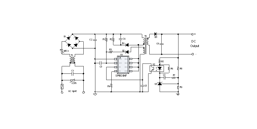 SP6638HF是一顆電流模式PWM控制芯片,內置功率MOSFET,用于功率在18W以內的方案。該芯片在系統輸出空載時工作在跳頻模式,在系統輸出輕載到中等負載階段工作在PFM模式,在輸出重載時工作在最大恒定工作頻率。SP6638HF的啟動電流和工作電流設定的比較小,以此減小待機時的功耗。芯片內置有斜坡補償電路,避免次諧波振蕩的發生,改善系統的穩定性。芯片內置有前沿消隱時間(Leading-edge blanking time),消除緩沖網絡中的二極管反向恢復電流對電路的影響。該芯片帶有抖頻功能,能夠有效改善系統的EMI性能。芯片最低的工作頻率設置在音頻以上,在工作時可以避免系統產生噪音。SP6638HF內置多種保護,包括逐周期限流保護(OCP),過壓保護(OVP),VDD過壓箝位,欠壓保護(UVLO),過溫保護(OTP)等,通過內部的圖騰柱驅動結構可以更好的改善系統的EMI特性和開關的軟啟動控制。SP6638HF使用SOP8無鉛封裝。