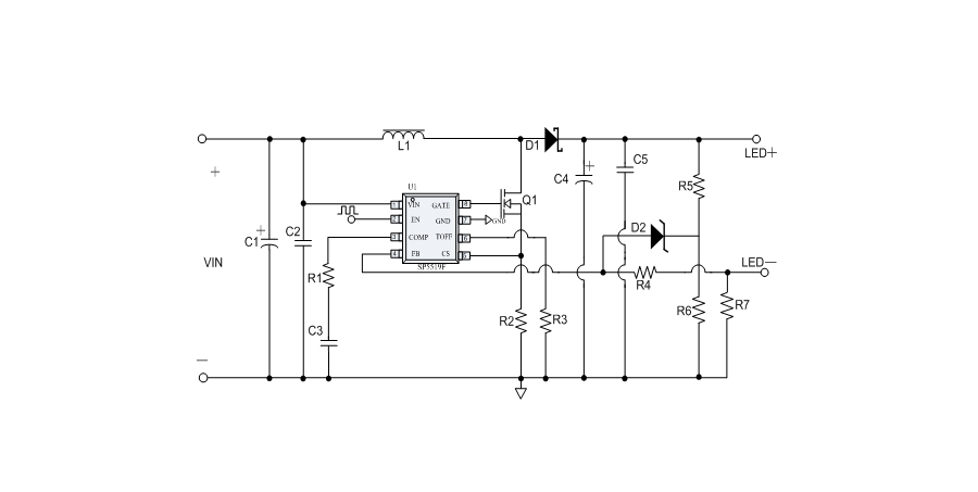 SP5519F提供完善的保護功能,包括輸入電壓欠壓保護(UVLO)、逐周期的功率管過流保護(OCP)、過溫保護(OTP)。