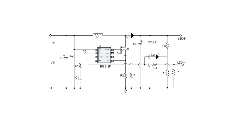 SP5518F是一顆高效率、升壓型LED驅(qū)動(dòng)控制芯片,采用固定關(guān)斷時(shí)間控制模式,開關(guān)頻率可達(dá)1MHZ,關(guān)斷時(shí)間可以通過外部電容調(diào)節(jié),LED電流可以通過外部電阻進(jìn)行設(shè)置。