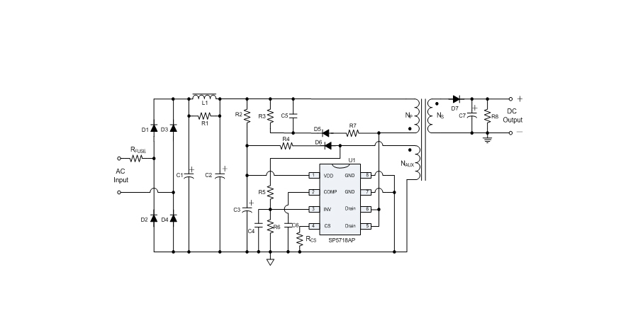 SP5718AP是一顆高精度離線式開關電源電路,應用于低功耗AC/DC充電器與適配器。SP5718AP使用原邊取樣來進行精確的恒流、恒壓控制,可以省去一般應用中的光耦與TL431。