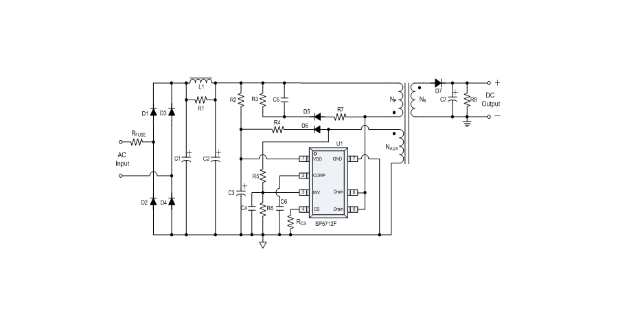 SP5712提供上電軟啟動功能與各種可自恢復的保護功能,包括逐周期限流保護(OCP),VDD過壓保護(OVP),VDD過壓箝位,欠壓保護(UVLO)等。SP5712具有的抖頻功能,可以提供更好的EMI性能。