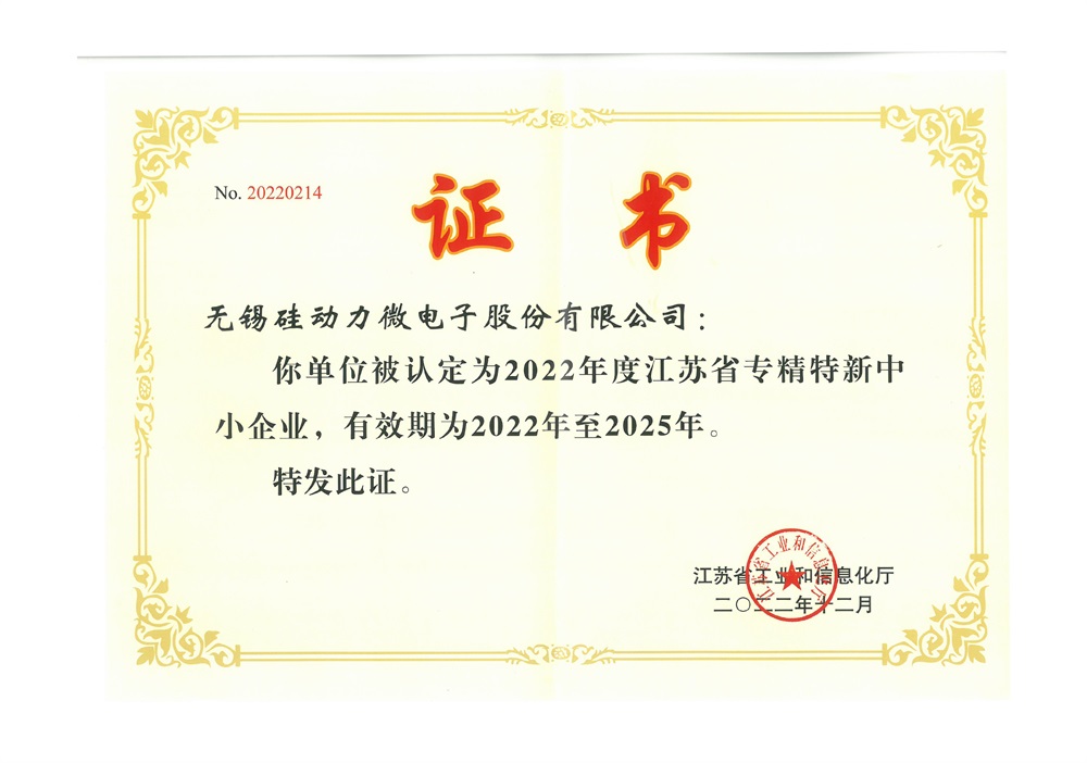 近日,無錫硅動力微電子股份有限公司(以下簡稱:無錫硅動力)被江蘇省工業和信息化廳評為江蘇省專精特新中小企業,充分體現了省工業和信息化廳對無錫硅動力在創新能力、研發能力、技術實力及行業專業化程度等方面的高度認可。有利于公司更好地專注核心業務,有利于提升公司核心競爭力和行業影響力,對公司未來的發展產生積極的影響。