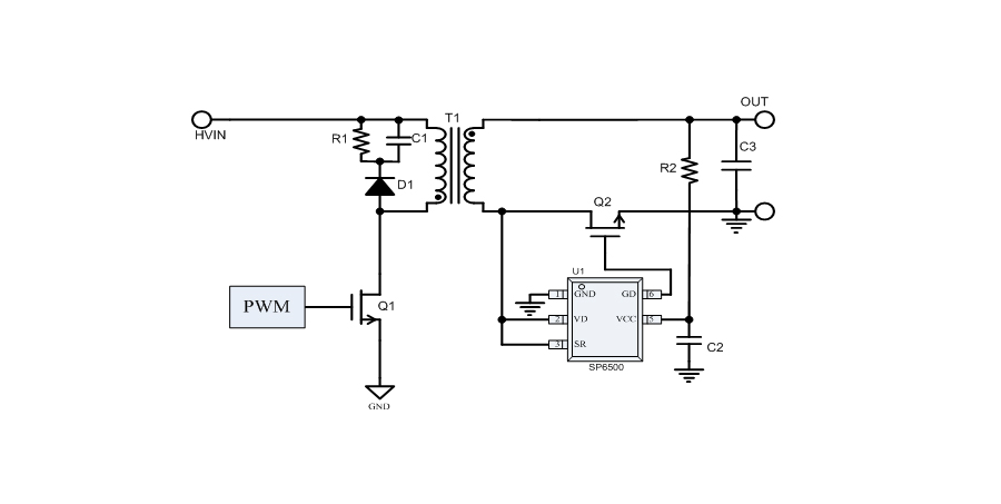 SP6500通過檢測外置MOSFET的漏源電壓,控制MOSFET的導通與截止。應用外圍簡單,適用于5~12V輸出的應用方案。