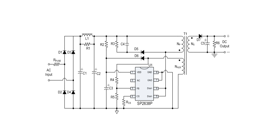 SP2638P提供全面的保護功能,包括逐周期限流保護(OCP)、VDD過壓保護(OVP)、VDD欠壓保護(UVLO)、FB過壓保護、輸出短路保護、輸出過壓保護、過溫保護等。其中,輸出短路保護、輸出過壓保護具有自動重啟恢復的功能。