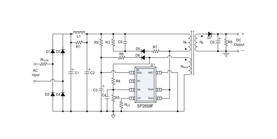 SP2698F is a high performance offline PSR power switch for low power AC/DC charger and adapter applications. It operates in primary-side sensing and regulation. Thus, opto-coupler and TL431 are not required. In CC control, the output current and power setting can be adjusted externally by the sense resistor RCS at CS PIN. In CV control, multi-mode operations are utilized to achieve high performance and high efficiency. In addition, good load regulation is achieved by the built-in cable drop compensation. SP2698F operates in PFM in CC mode, and it operates in PWM+PFM in CV mode with frequency reduction at light/medium load. The chip consumes very low operation current. It achieves less than 75mW standby power to meet all global energy efficiency regulations.
