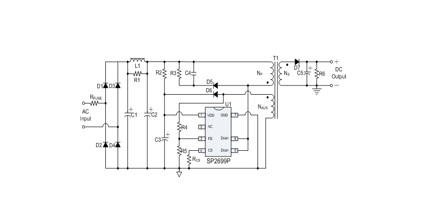 SP2699P is a high performance offline PSR power switch for low power AC/DC charger and adapter applications. It operates in primary-side sensing and regulation. Thus, opto-coupler and TL431 are not required. In CC control, the output current and power setting can be adjusted externally by the sense resistor RCS at CS PIN. In CV control, multi-mode operations are utilized to achieve high performance and high efficiency. In addition, good load regulation is achieved by the built-in cable drop compensation. SP2699P operates in PFM in CC mode, and it operates in PWM+PFM in CV mode with frequency reduction at light/medium load. The chip consumes very low operation current. It achieves less than 75mW standby power to meet strict standby power standard.SP2699P offers comprehensive protection coverage with auto-recovery feature including Cycle-by-Cycle current limiting, VDD over voltage protection (OVP), FB over voltage protection, FB under voltage protection, load short circuit protection, VDD under voltage lockout (UVLO), OTP etc.