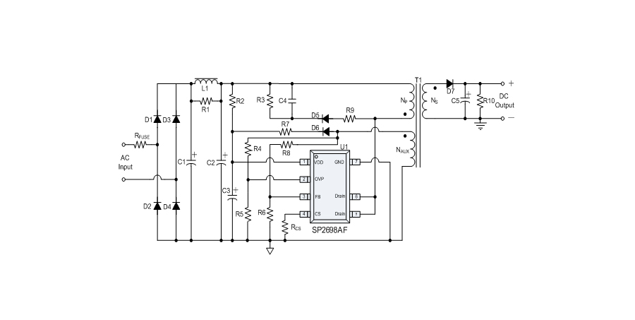SP2698AF offers comprehensive protection coverage with auto-recovery feature including Cycle-by-Cycle current limiting, VDD over voltage protection (OVP), FB over voltage protection, load short circuit protection, VDD under voltage lockout (UVLO), Output OVP, Output UVP, OTP etc.